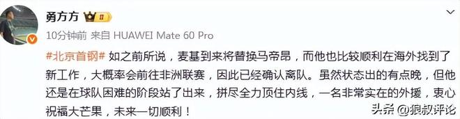北京时间3月5日,根据媒体人“勇方方”的报道,麦基到来将替换马帝昂,而他也比较顺利在海外找到了新工作,大概率会前往非洲联赛,因此已经确认离队。虽然状态出的有点晚,但他还是在球队困难的阶段站了出来,拼尽全力顶住内线,一名非常实在的外援,衷心祝福大芒果,未来一切顺利! 。