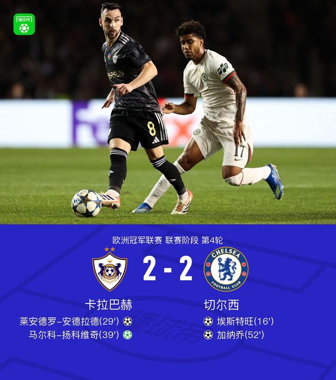 2-2战平切尔西,卡拉巴赫首次在欧战对阵英格兰球队拿分