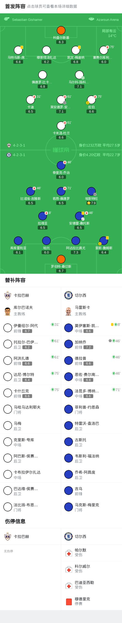 首开记录,埃斯特旺当选卡拉巴赫vs切尔西全场最佳